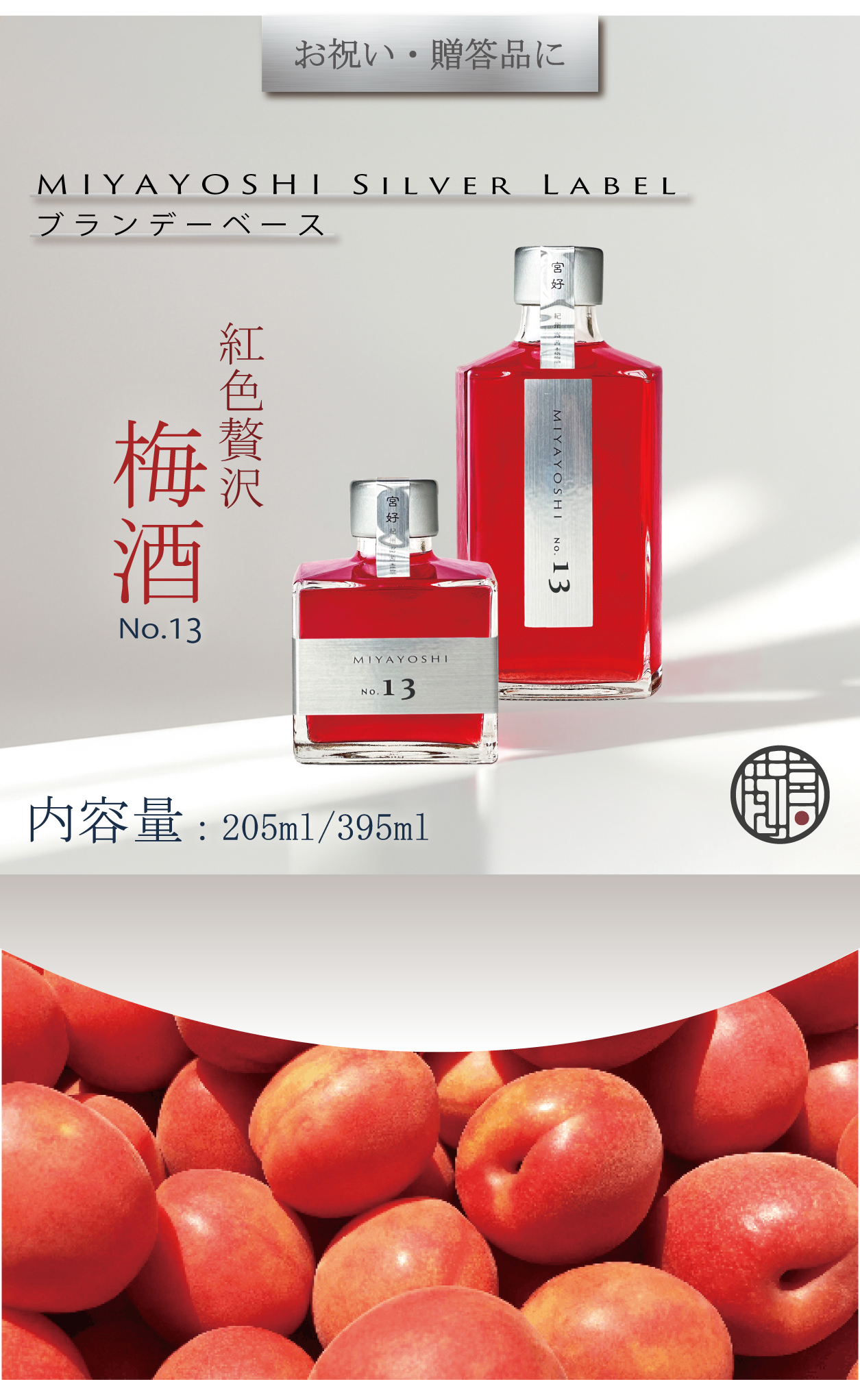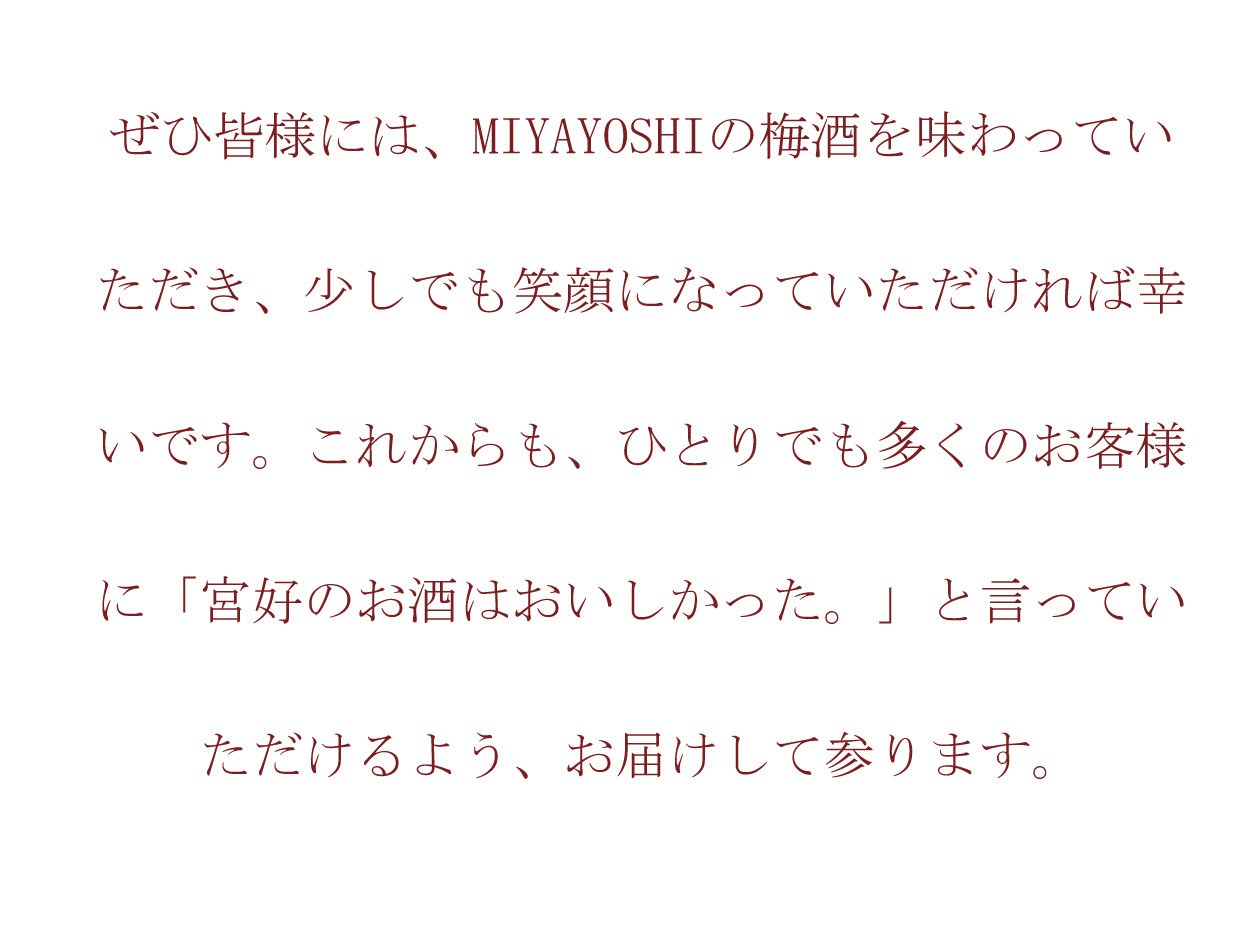 無添加梅酒 MIYAYOSHI SILVER LABEL はベースに使うブランデーのまろやかな味わいに「つゆあかね」のさわやかな酸味と香りが引き立つ、余韻をゆったりと楽しむことができる梅酒です。