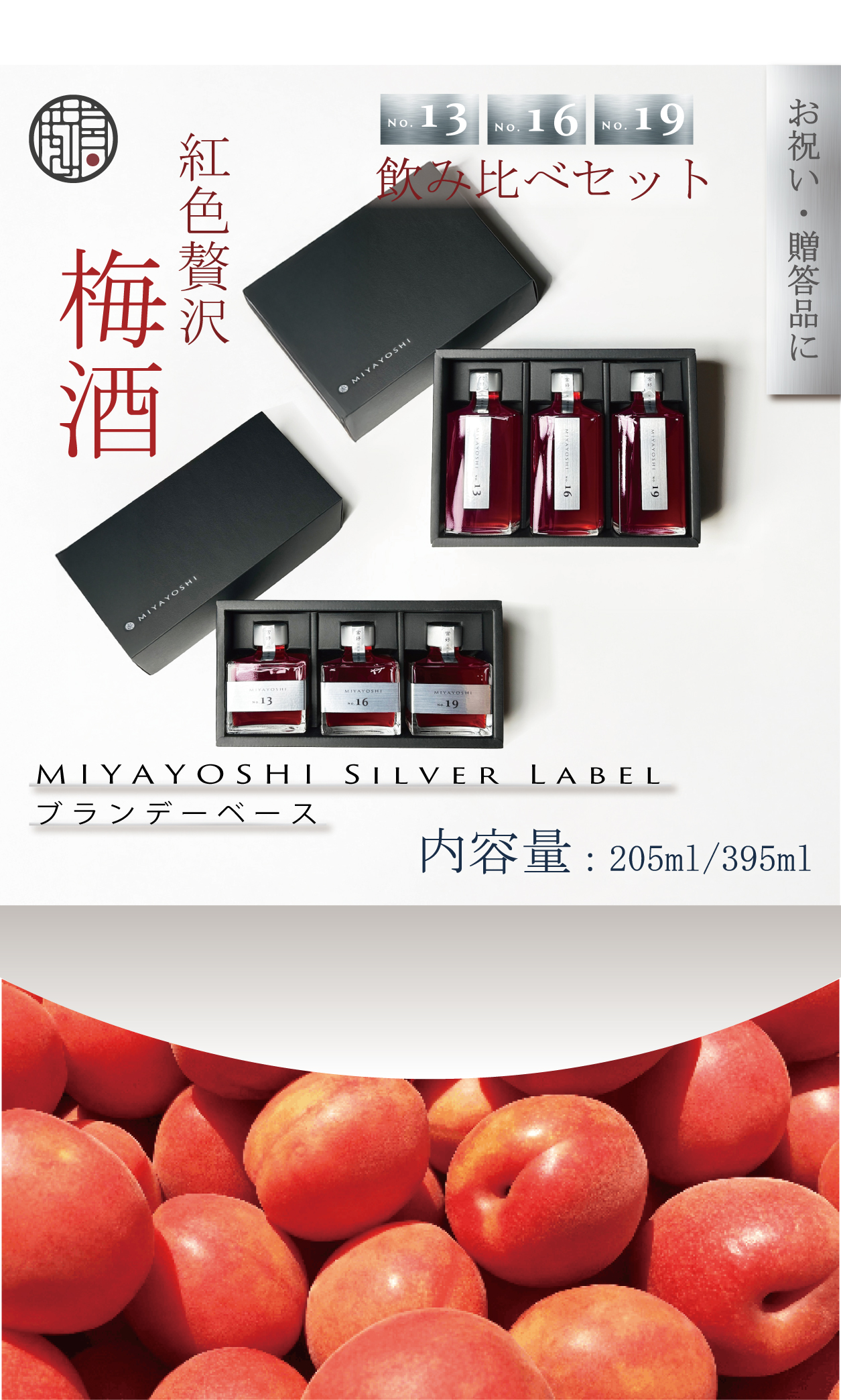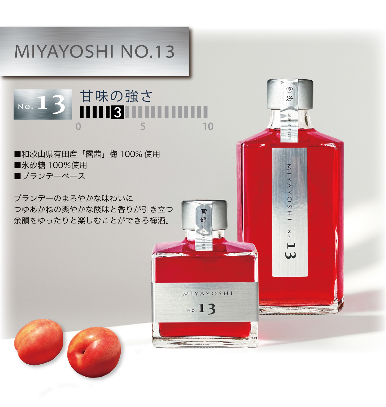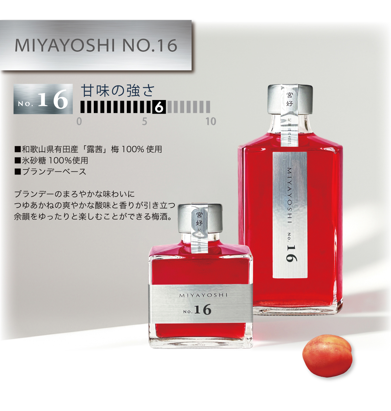 無添加梅酒 MIYAYOSHI SILVER LABEL はベースに使うブランデーのまろやかな味わいに「つゆあかね」のさわやかな酸味と香りが引き立つ、余韻をゆったりと楽しむことができる梅酒です。