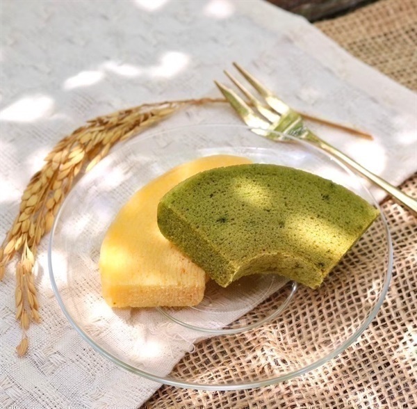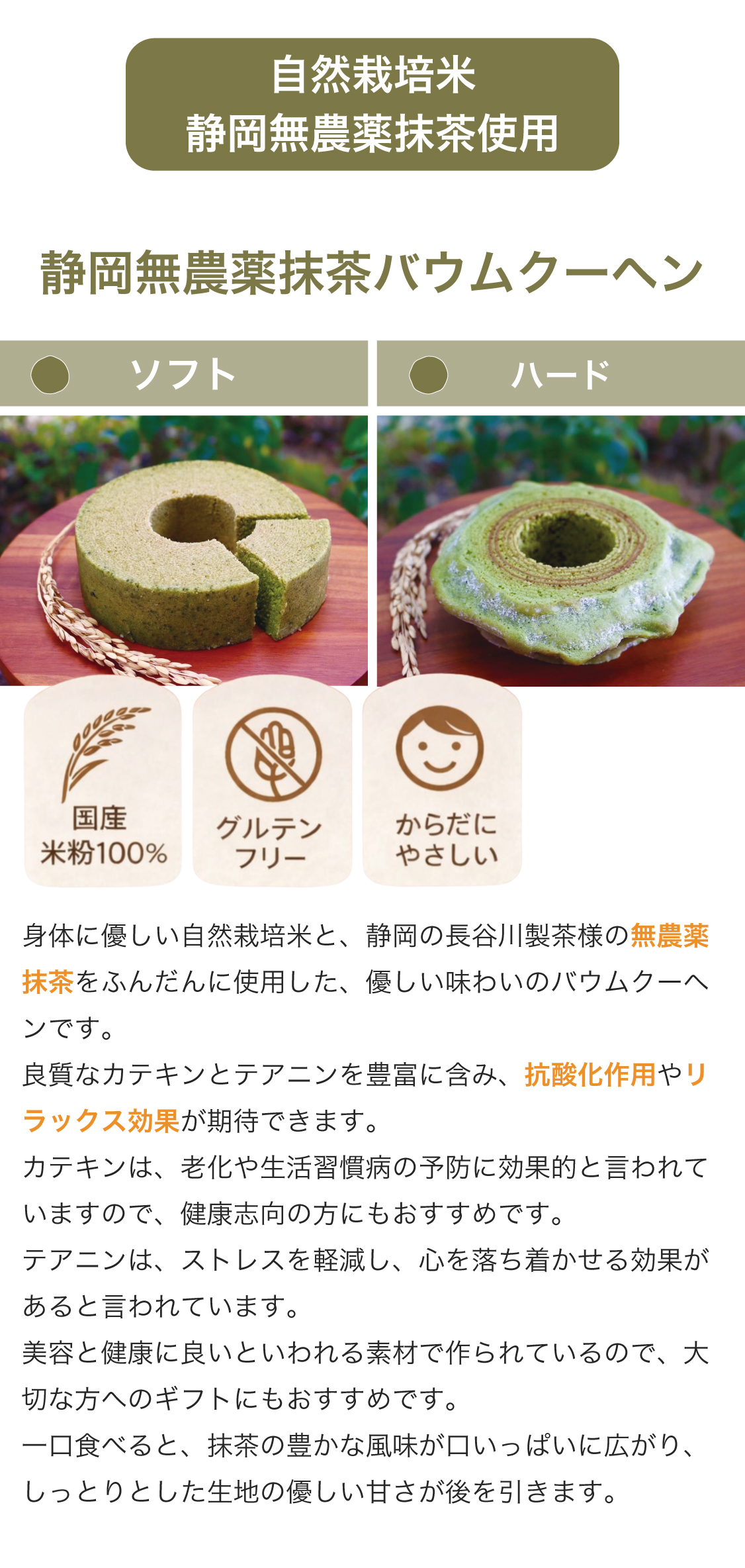 ※《抹茶バウム》には、特別栽培米生米粉の玄米を使用。無農薬静岡抹茶使用。