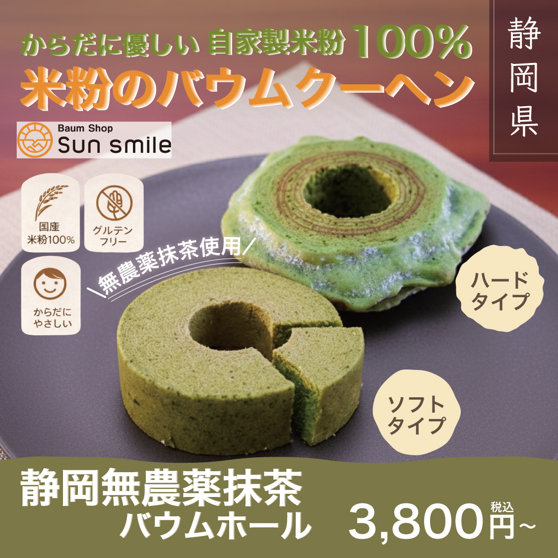 ”からだに優しい自家製米粉100%” 静岡無農薬抹茶バウムクーヘン