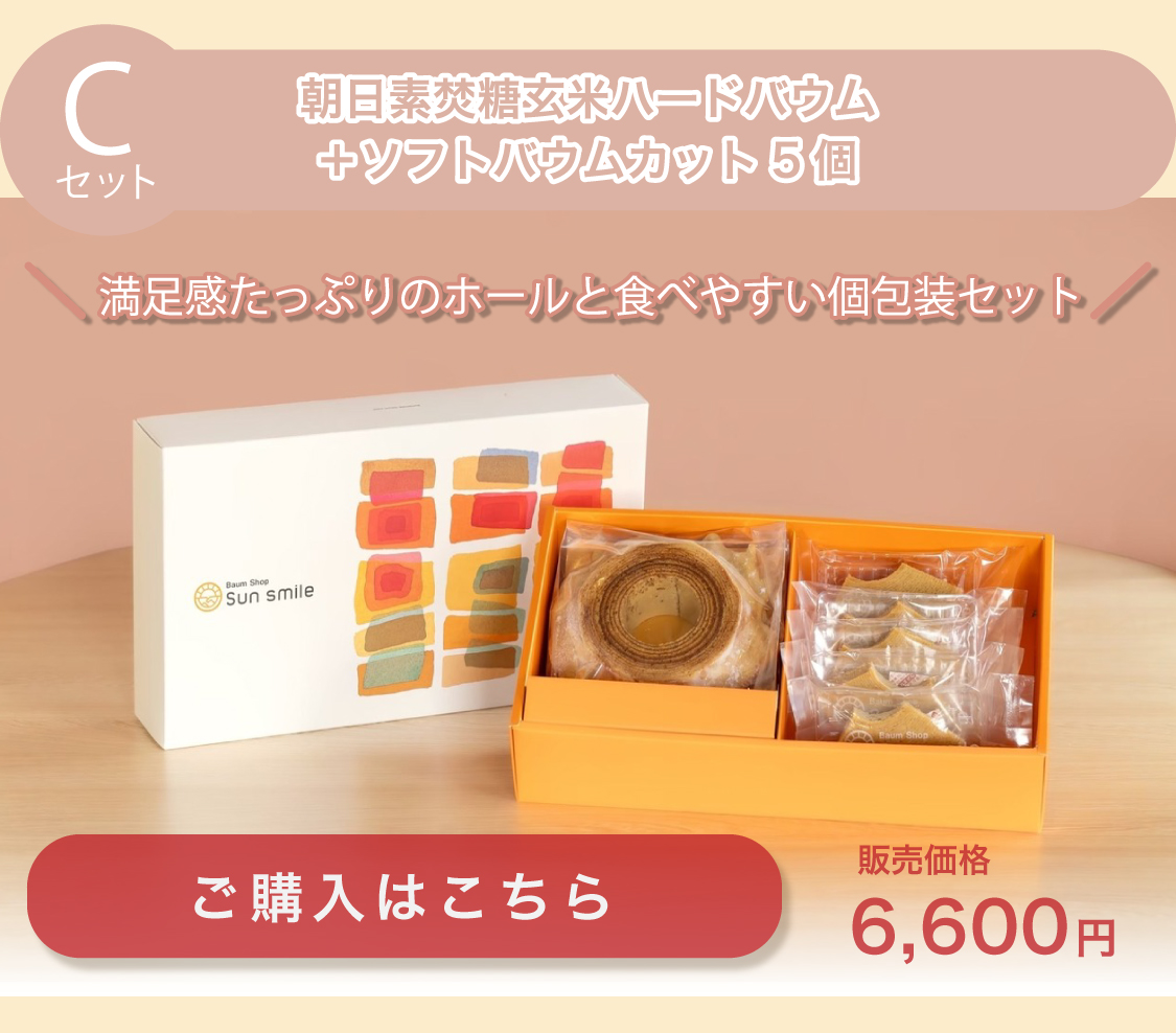 【贈答品におすすめ】” グルテンフリー朝日素焚糖玄米バウムクーヘンセット”(Cセット:朝日素焚糖玄米ハードホール&ソフトカット5個)