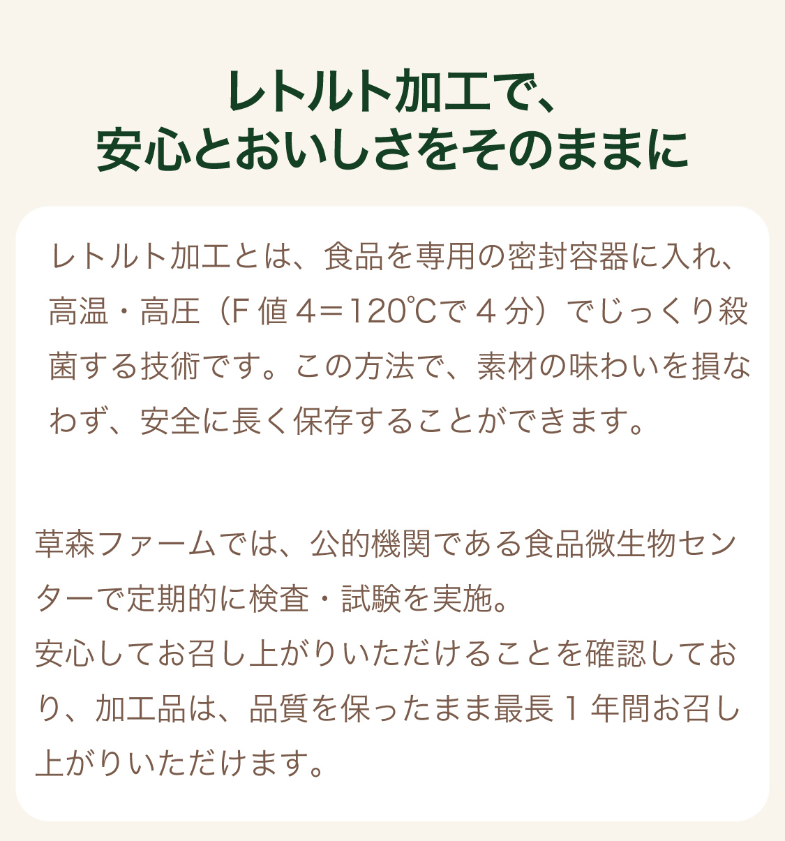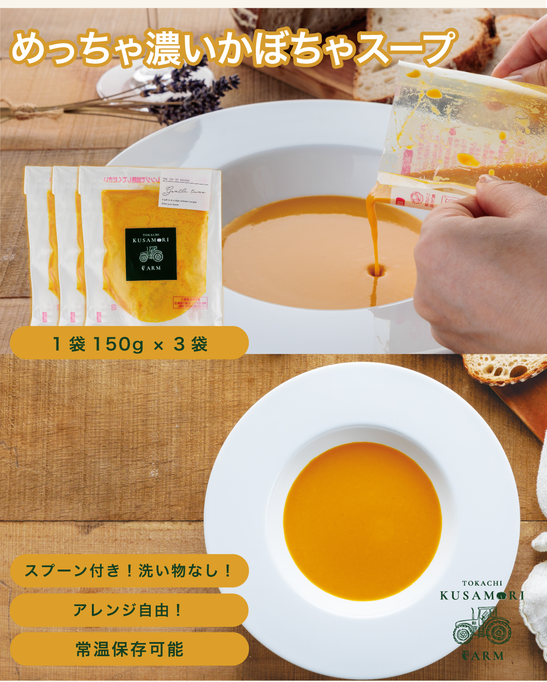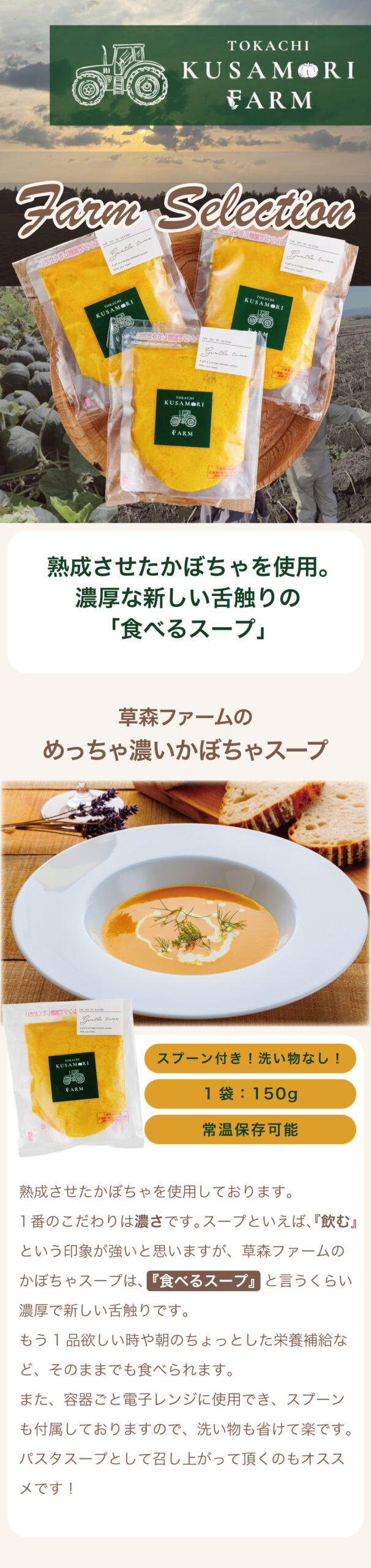 熟成させたかぼちゃを使用しております。1番のこだわりは濃さです。スープといえば、『飲む』という印象が強いと思いますが、草森ファームのかぼちゃスープは、『食べるスープ』と言うくらい濃厚で新しい舌触りです。もう1品欲しい時や朝のちょっとした栄養補給、など、そのままでも食べれます!