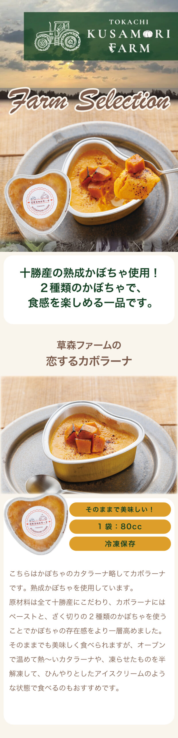 原材料は全て十勝産にこだわり、カボラーナにはペーストとざく切りと2種類のかぼちゃを使うことで