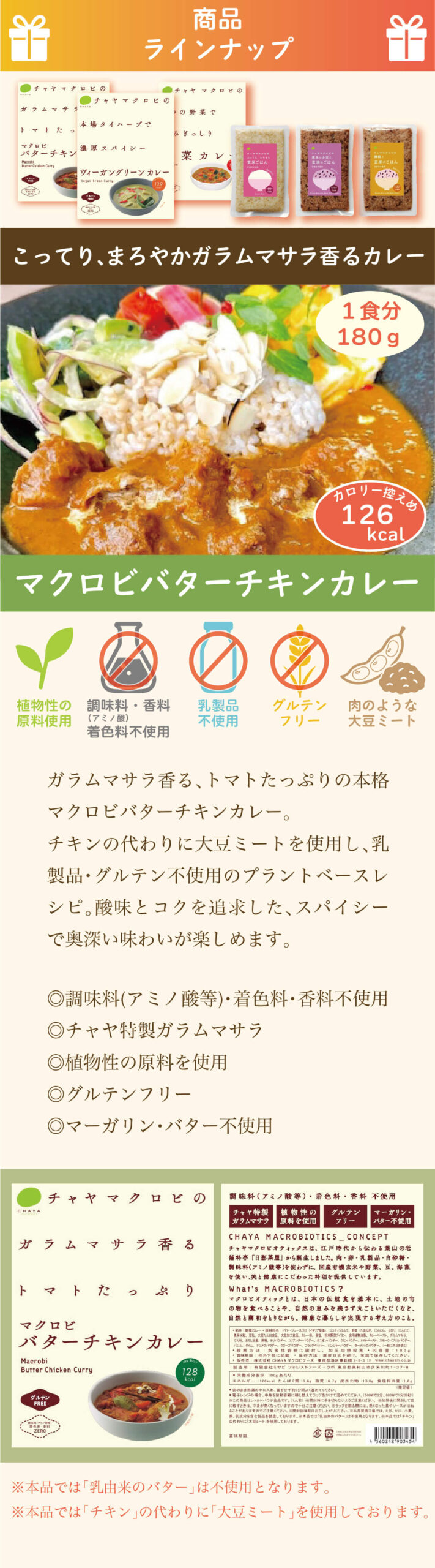 【マクロビバターチキンカレー】ダイストマト(イタリア製造)、ココナッツミルク、野菜(玉ねぎ、人参、セロリ)、米飴、豆乳、大豆加工食品、粒状大豆たんぱく、香辛料、トマトペースト、カレーペースト、カレー粉、食塩、野菜ブイヨン、食用植物油脂(菜種油、オリーブ油)、にんにくペースト、馬鈴薯でん粉、生姜ペースト、黒糖、オニオンパウダー、(一部に大豆を含む)