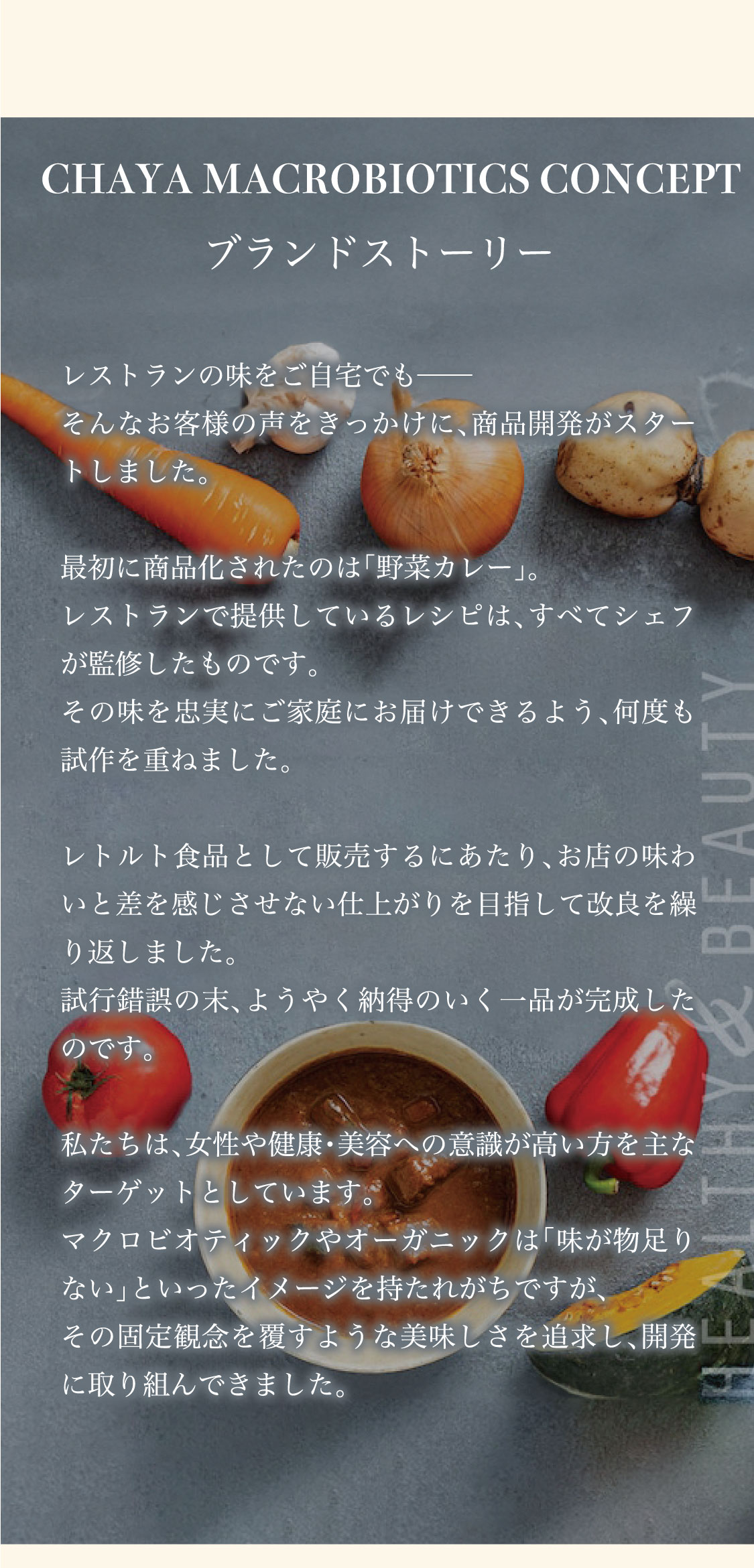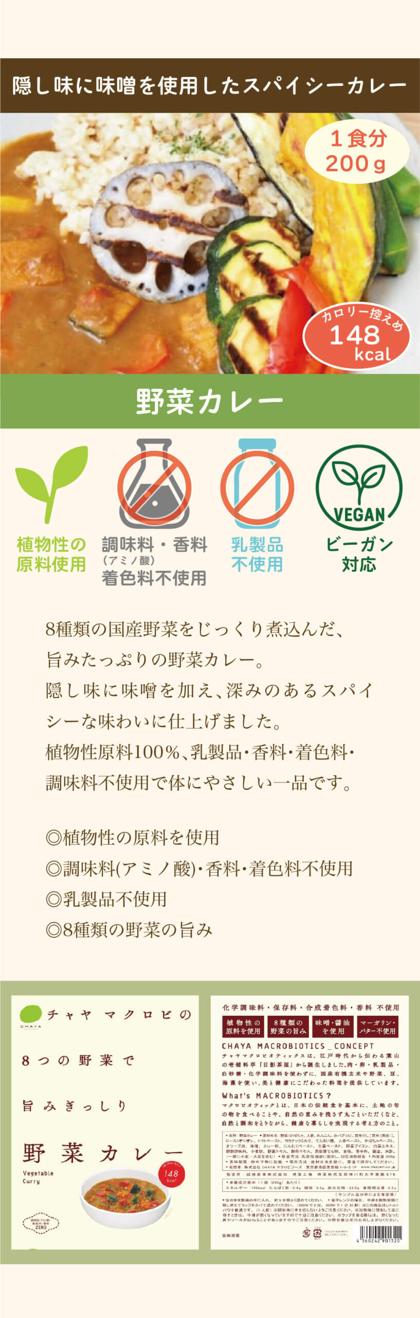 野菜(かぼちゃ、人参、れんこん、赤パプリカ)、昆布だし[昆布(国産)]、ローストオニオン、トマトペースト、ココナッツミルク、てんさい糖、人参ペースト、かぼちゃペースト、オリーブ油、味噌、カレー粉、にんにくペースト、生姜ペースト、野菜ブイヨン、白菜エキス、醗酵調味料、小麦粉、野菜エキス、酵母エキス、馬鈴薯でん粉、食塩、香辛料、醤油、米酢、(一部に小麦・大豆を含む)