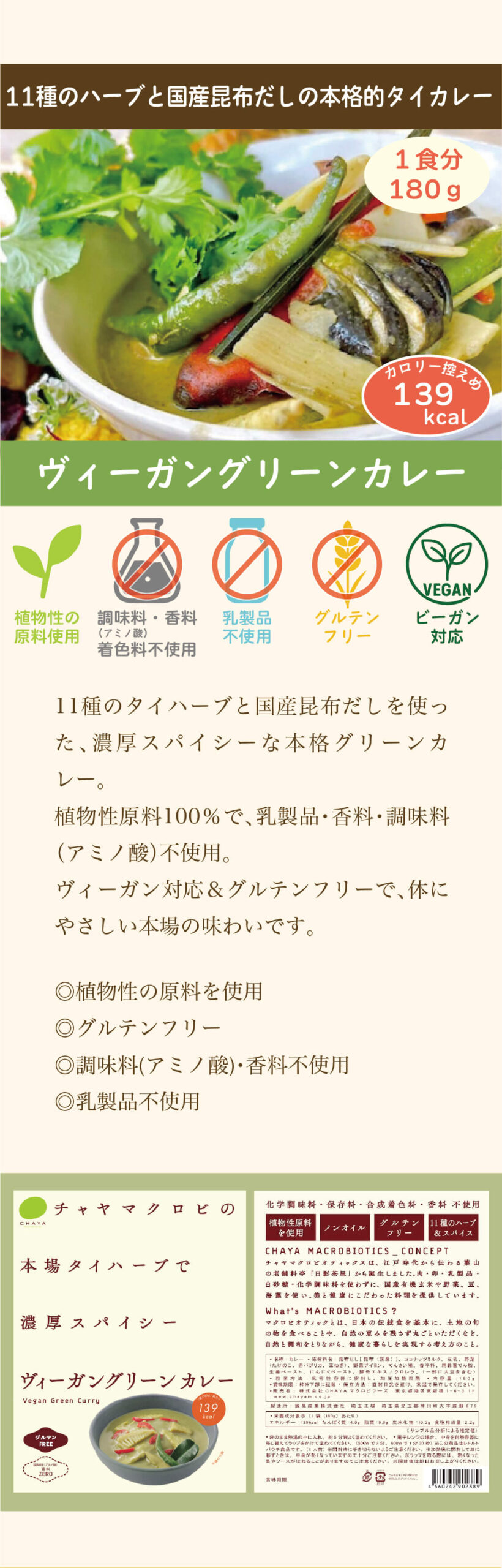 昆布だし[昆布(国産)]、ココナッツミルク、豆乳、野菜(たけのこ、赤パプリカ、玉ねぎ) 、野菜ブイヨン、てんさい糖、香辛料、馬鈴薯でん粉、生姜ペースト、にんにくペースト、酵母エキス/ クロレラ、( 一部 に大豆を含む)