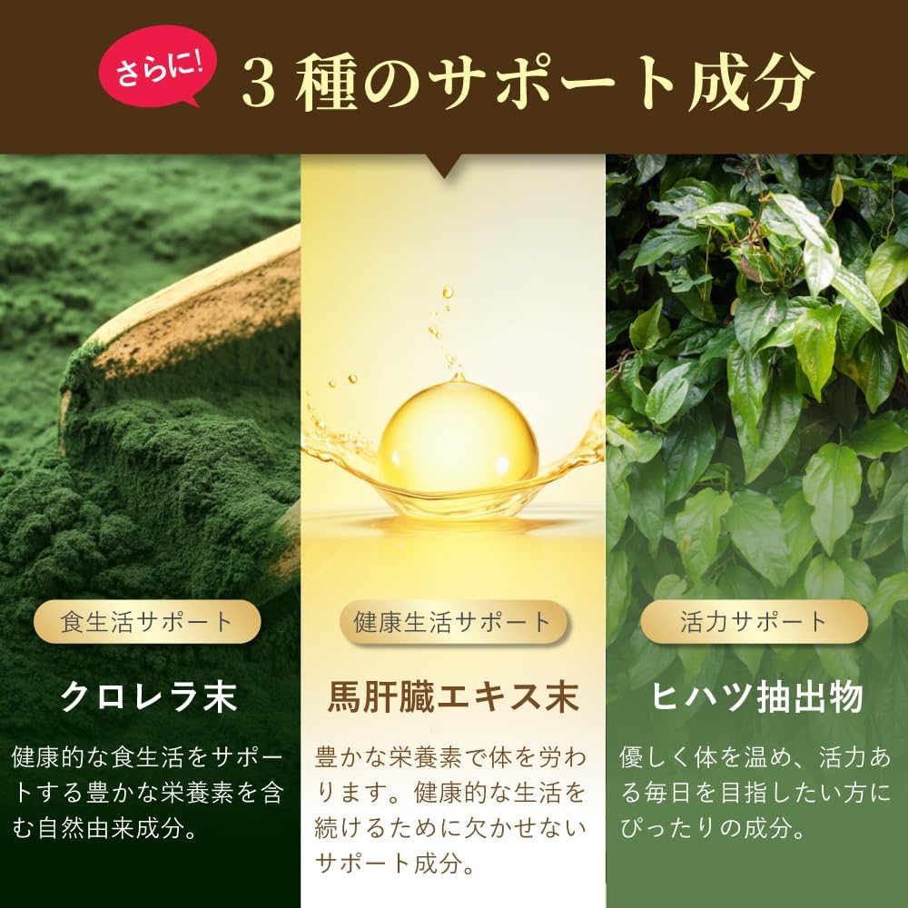 <3つのサポート成分> ●クロレラ末 – 豊富な栄養素を含み、体のバランスを整える ●馬肝臓エキス末 – たんぱく質やビタミン類が豊富で、活力をサポート ●ヒハツ抽出物 – 健康的なめぐりを促進し、内側から元気を引き出す