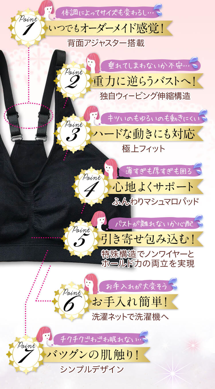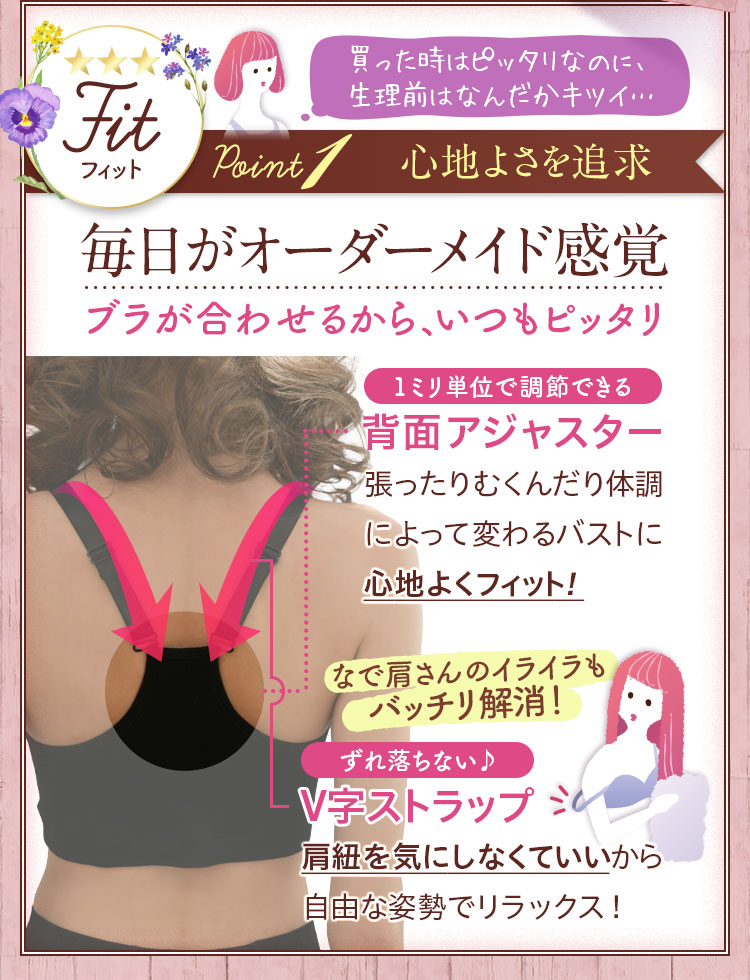 <こだわりポイント> ミリ単位で調節できる背面アジャスターで、オーダーメイド級のフィット感。 こだわり設計の24時間対応ブラで正しいケア習慣を。