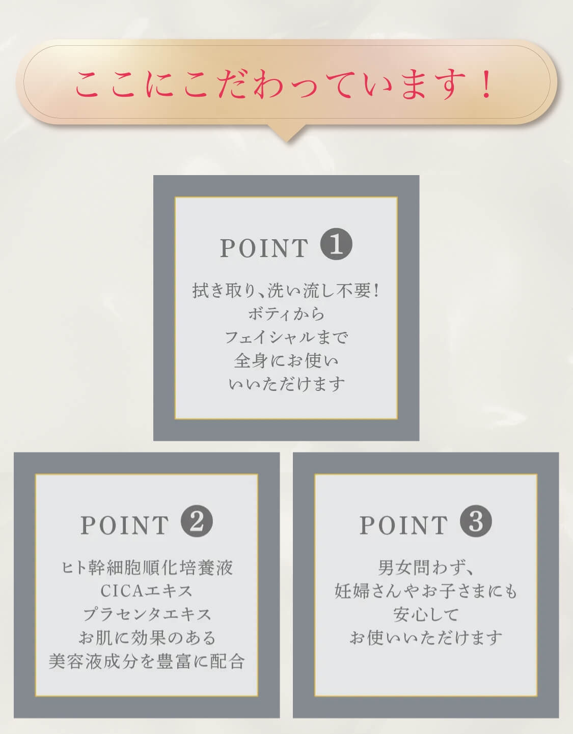 美容成分をたっぷり配合した贅沢な処方で、フェイスはもちろん、ボディにもお使いいただける万能アイテムです。