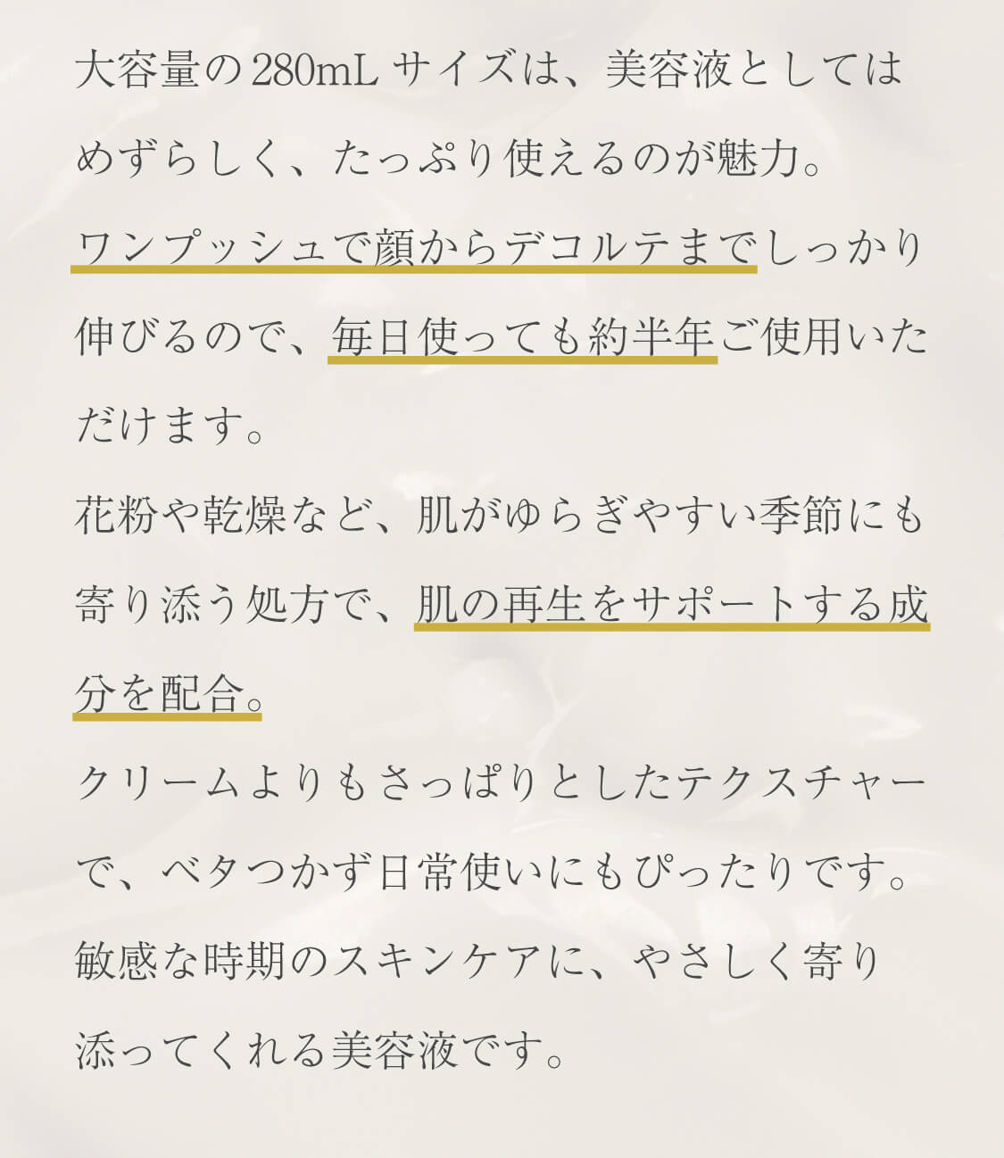 大容量の280mLサイズは、美容液としてはめずらしく、たっぷり使えるのが魅力。
