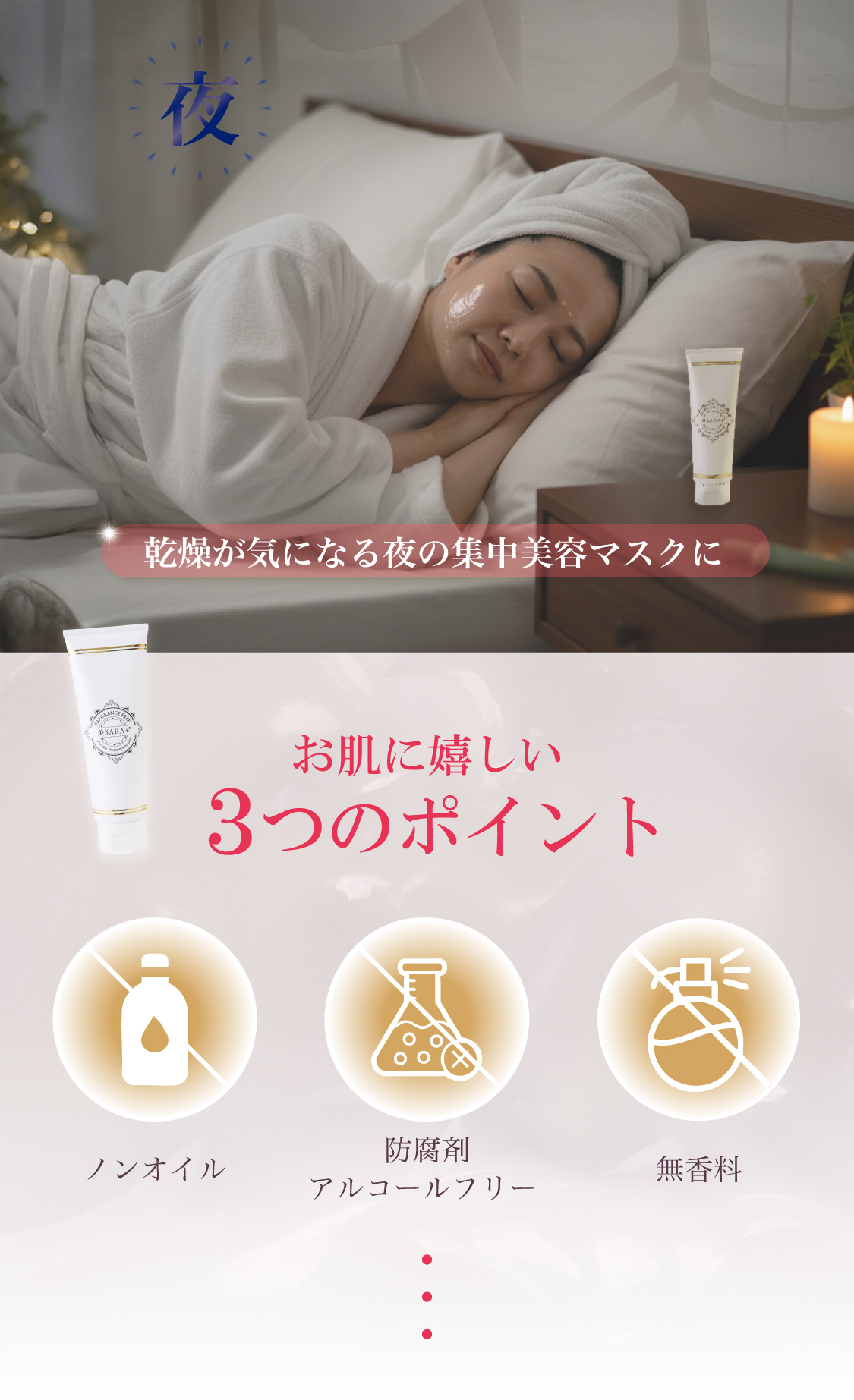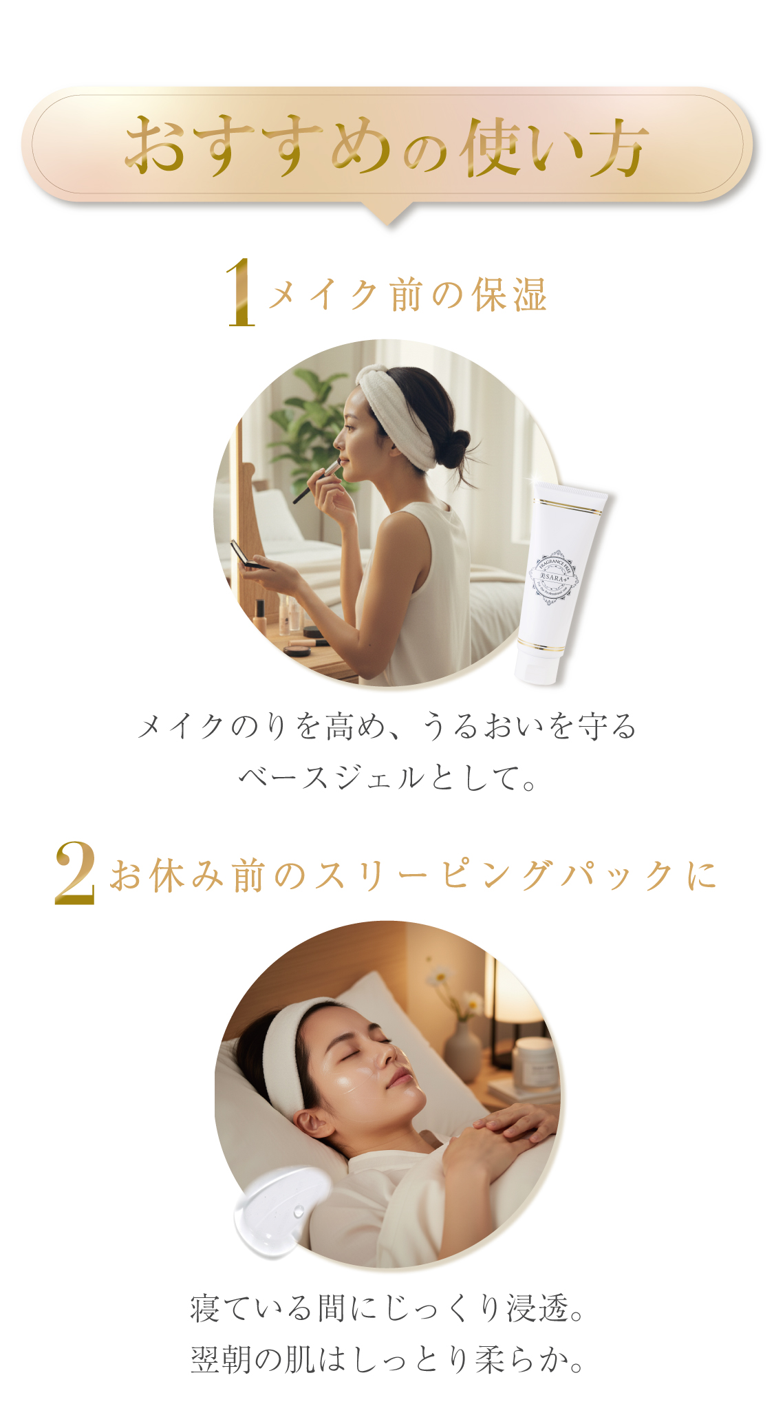 朝は日焼け止め前の保湿ケアとして、夜はお休み前のスリーピングパックとして。