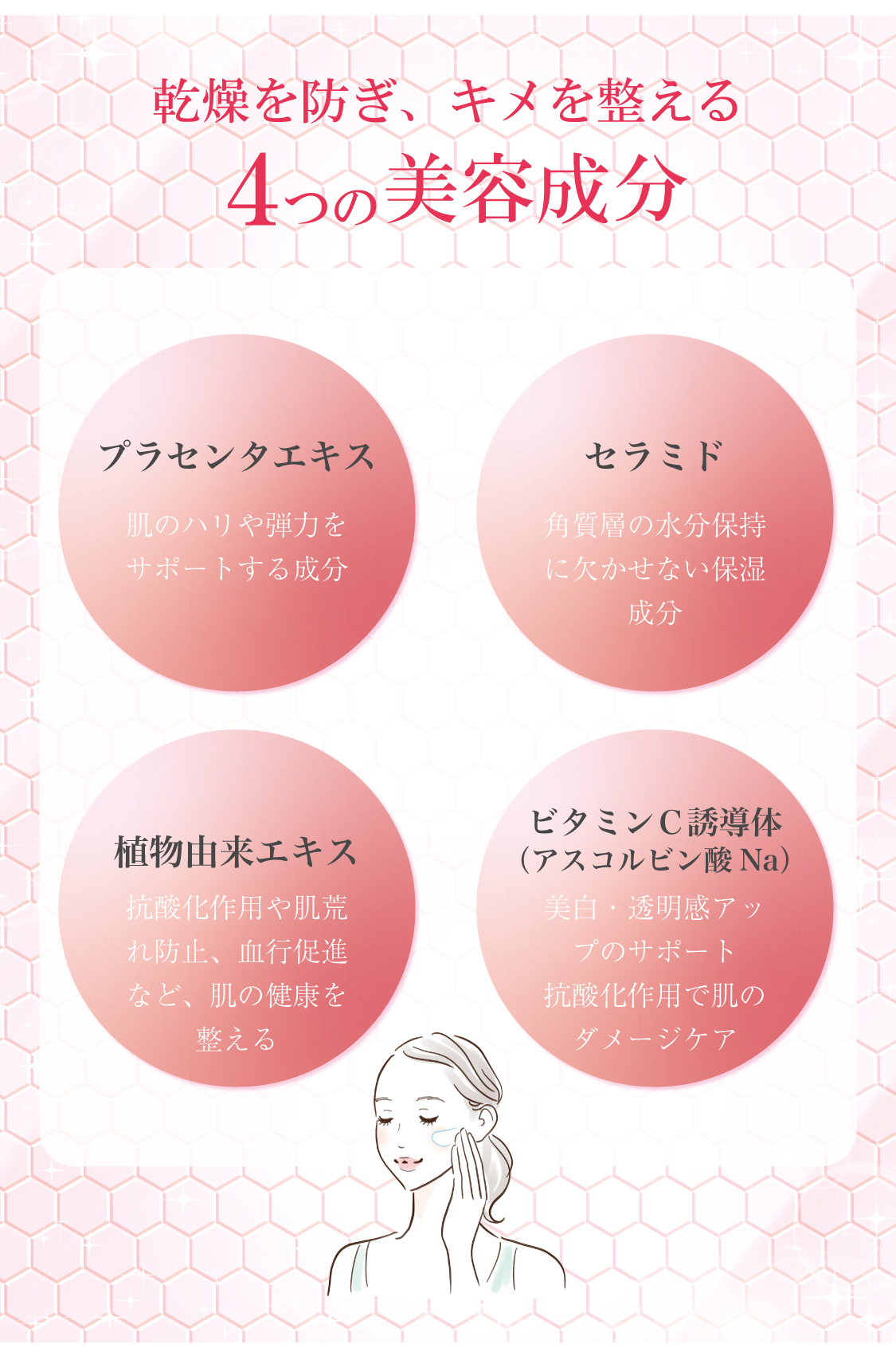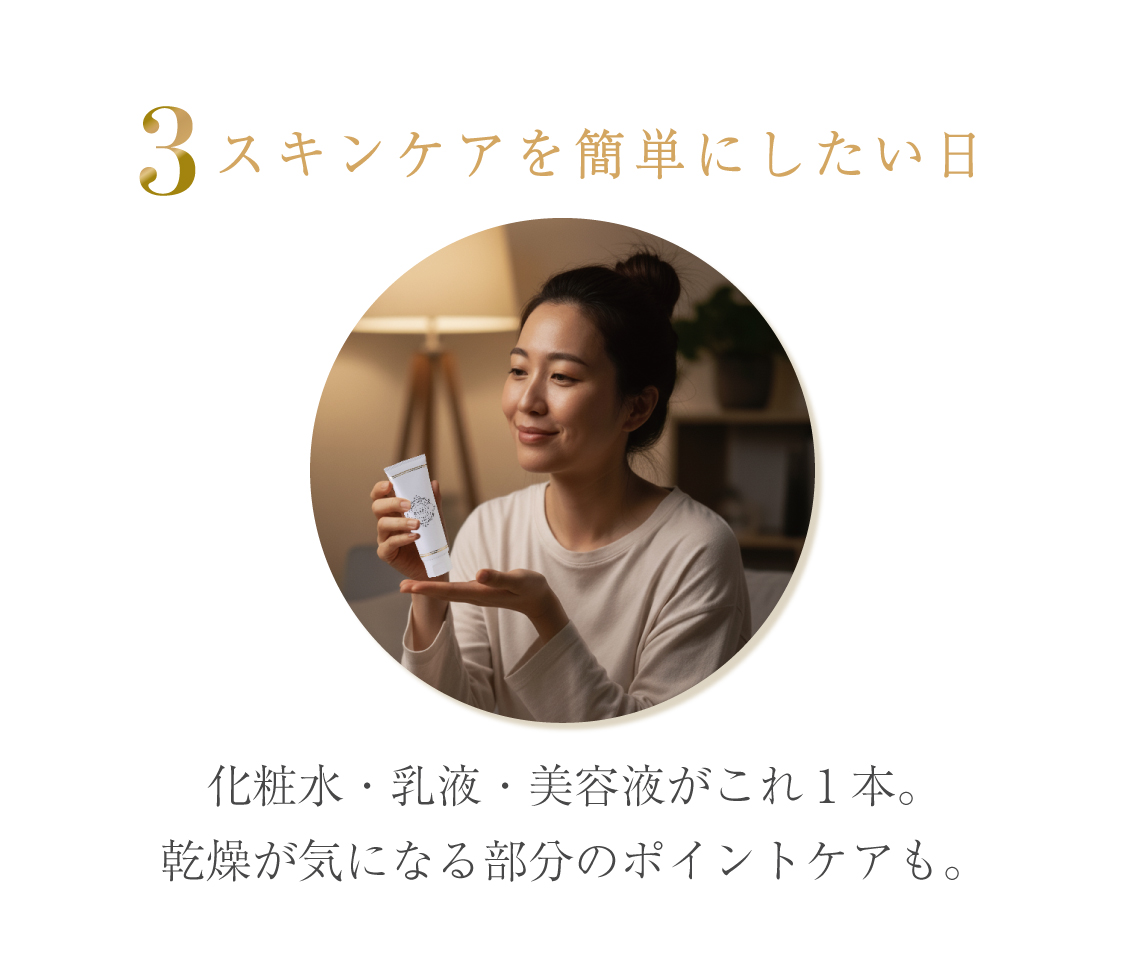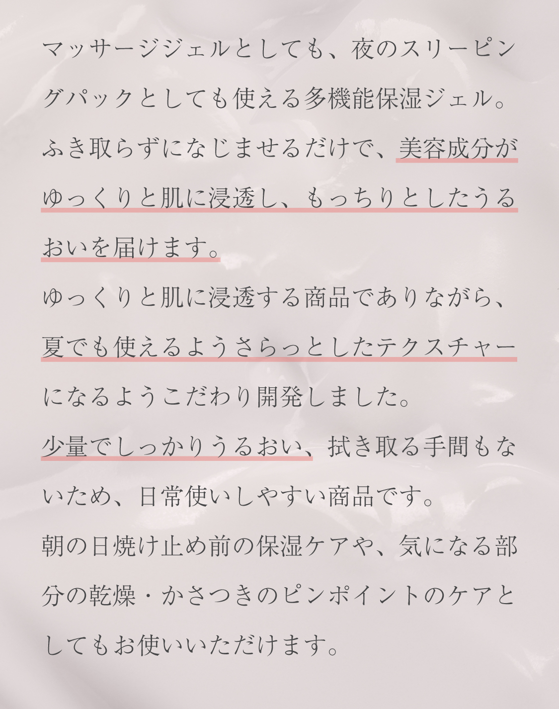 ゆっくりと肌に浸透する商品でありながら、夏でも使えるようさらっとしたテクスチャーになるようこだわり開発。