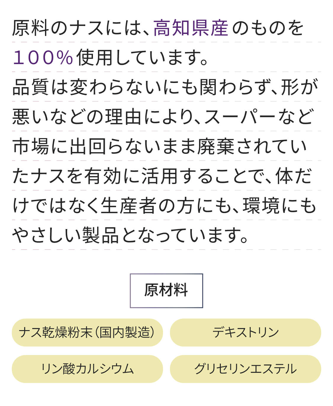 ナス乾燥粉末(国内製造)、デキストリン、リン酸カルシウム、グリセリンエステル