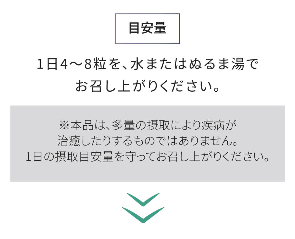 1日4~8粒を、水またはぬるま湯でお召し上がりください。