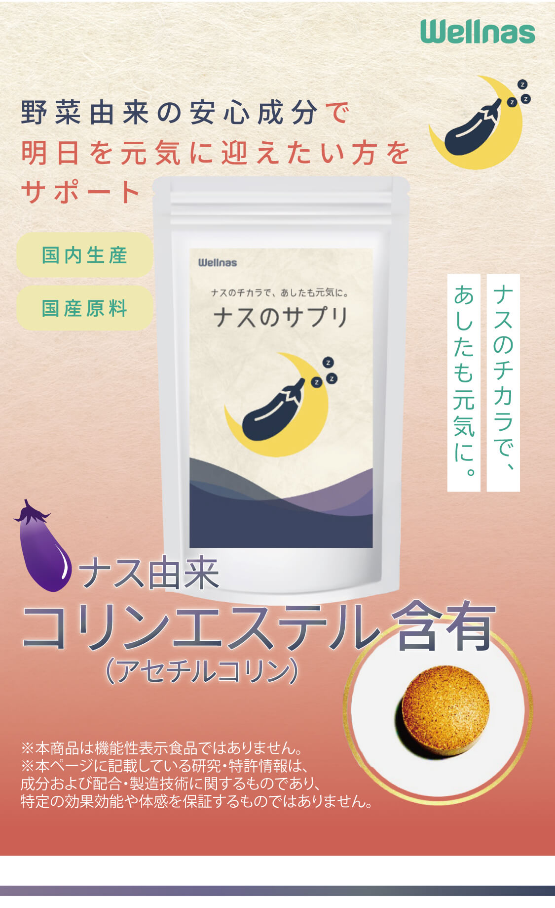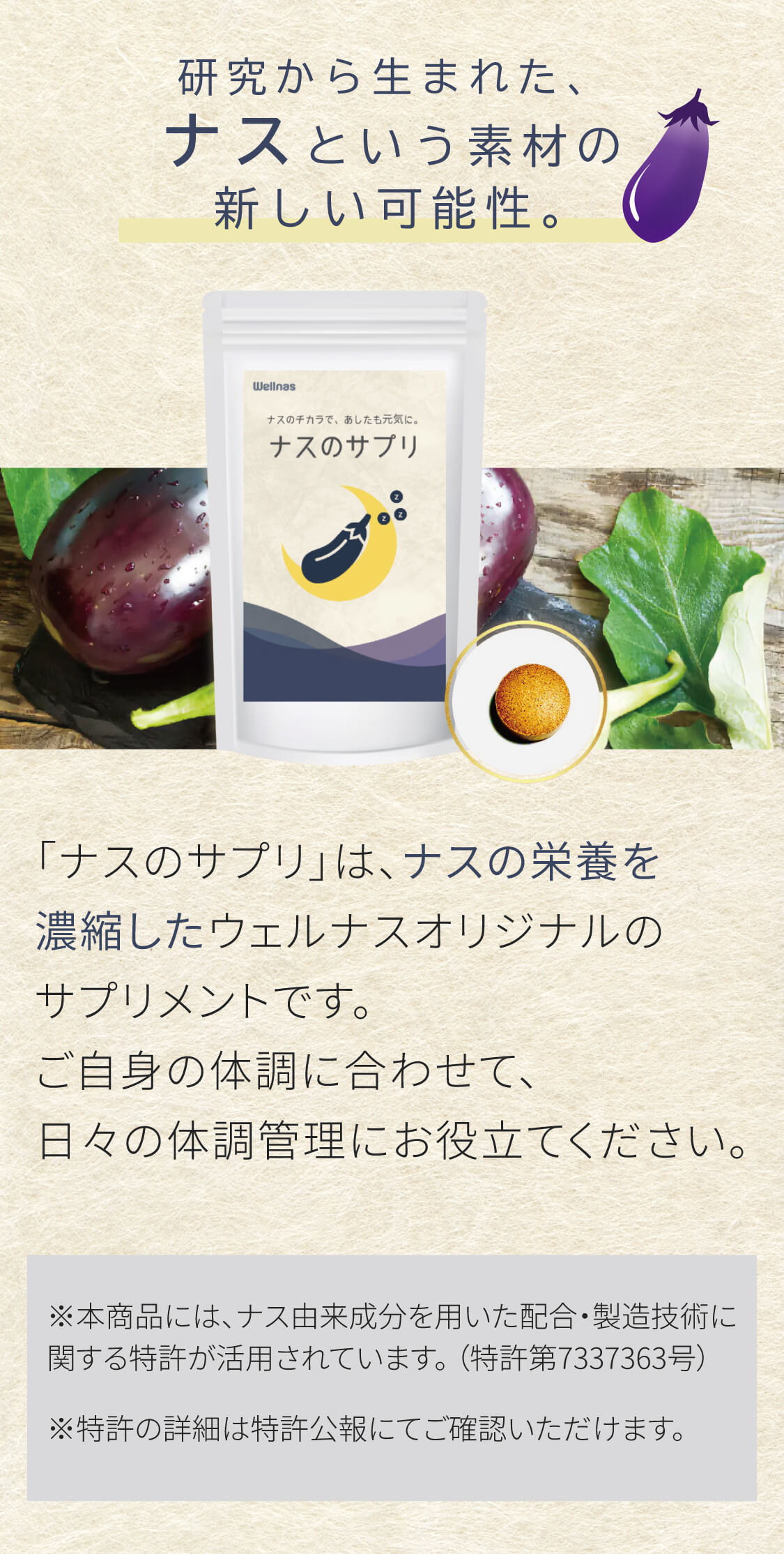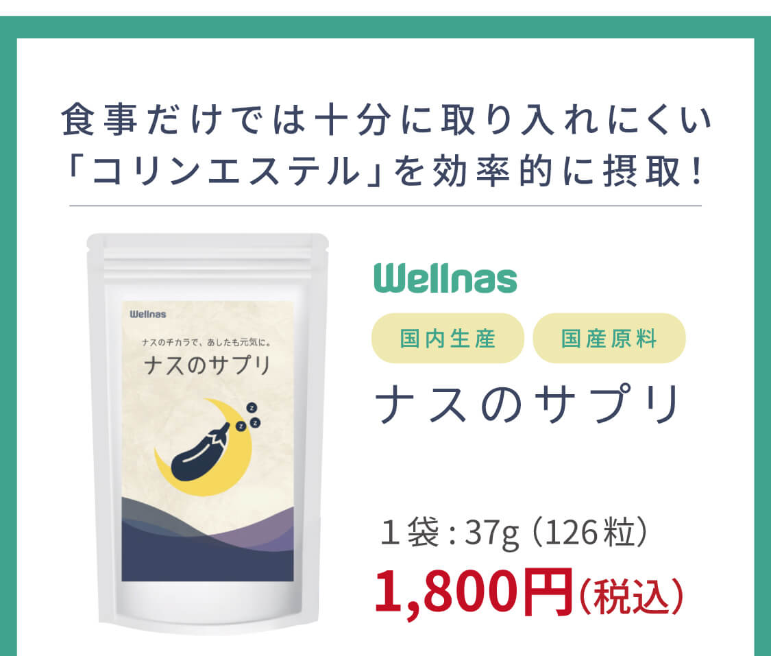 【ナスのサプリ】 「ナスのサプリ」は高知県産ナスの栄養を濃縮したウェルナスオリジナルのサプリメントです。ナスに由来する天然成分「コリンエステル」を含有しています。ご自身の体調に合わせて、日々の体調管理にお役立てください。 ◆特許第7337363号 ※本品は、多量の摂取により疾病が治癒したりするものではありません。 1日の摂取目安量を守ってお召し上がりください。