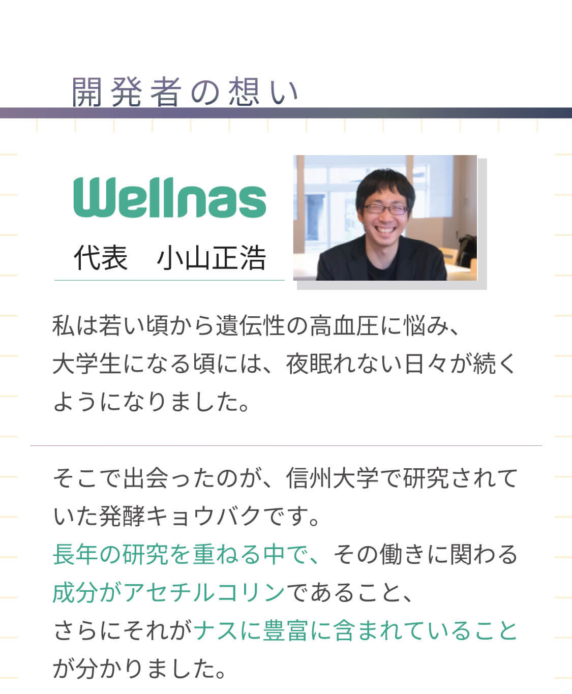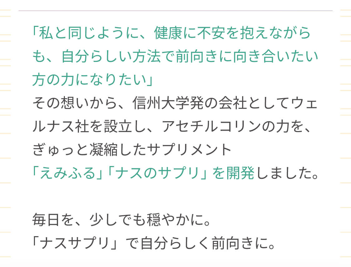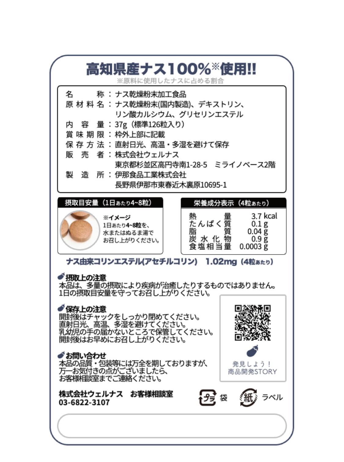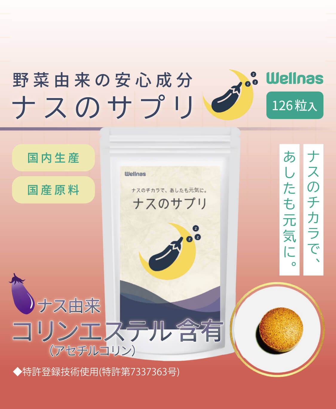 【ナスのサプリ】 「ナスのサプリ」は高知県産ナスの栄養を濃縮したウェルナスオリジナルのサプリメントです。ナスに由来する天然成分「コリンエステル」を含有しています。ご自身の体調に合わせて、日々の体調管理にお役立てください。 ◆特許第7337363号 ※本品は、多量の摂取により疾病が治癒したりするものではありません。 1日の摂取目安量を守ってお召し上がりください。